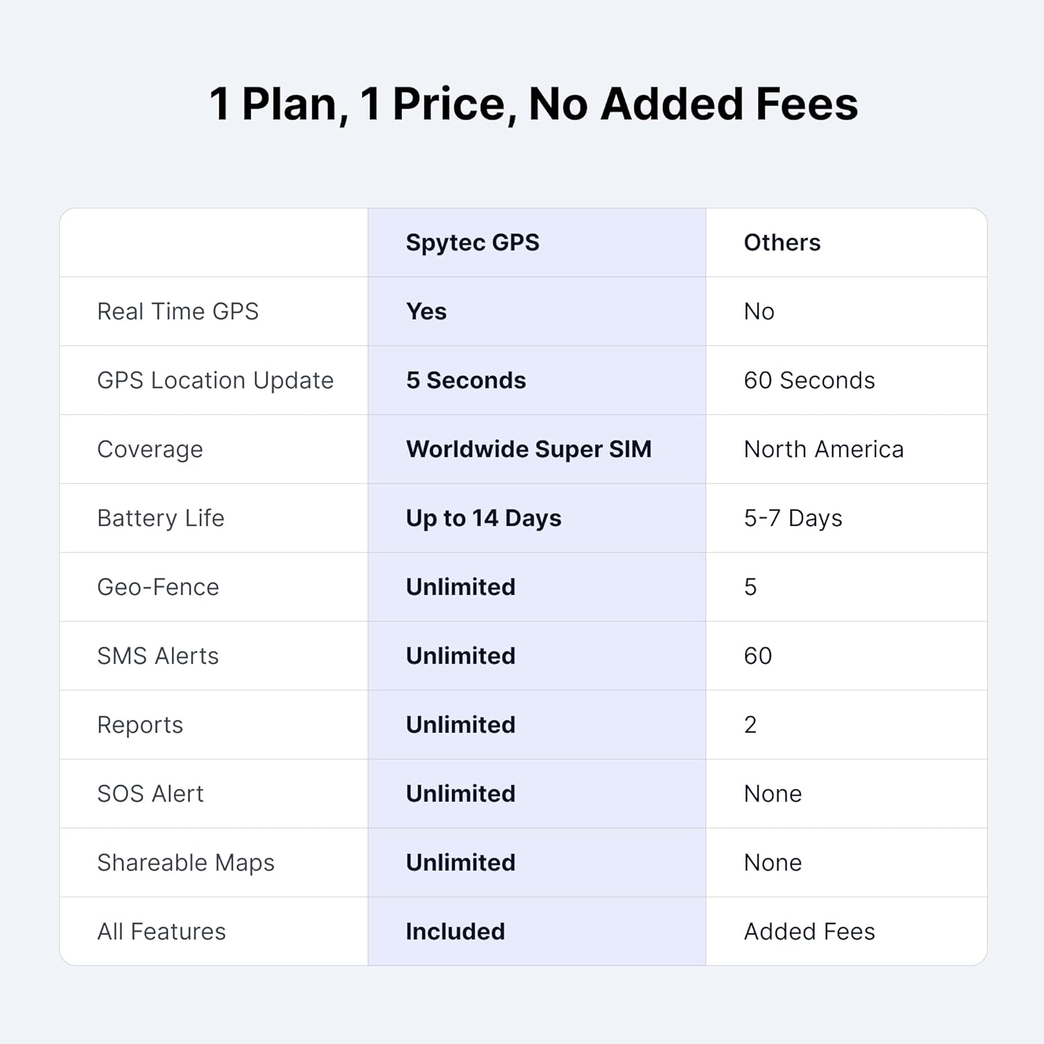 Our industry-leading 5 second updates are standard with our trackers. Other companies will advertise a lower price, but they charge you extra for pinging more than every 60 seconds.