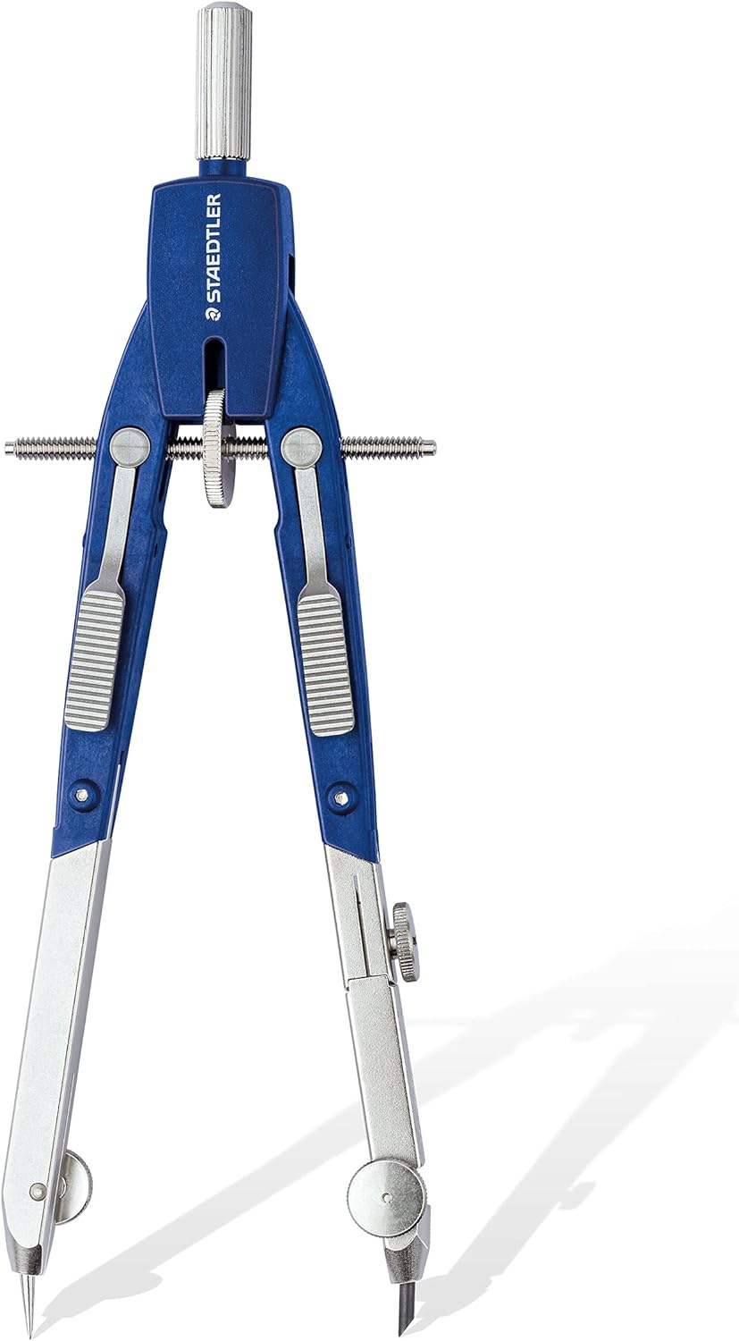 Compass, metal. 2PC set. Quick setting 6″ Compass & Universal adapter. Push-button mechanism and center wheel. Hinged lead and needle legs. Extra needle & leads. Maximum Circle drawn is 13.75″. Overall compass length is 6.75″.