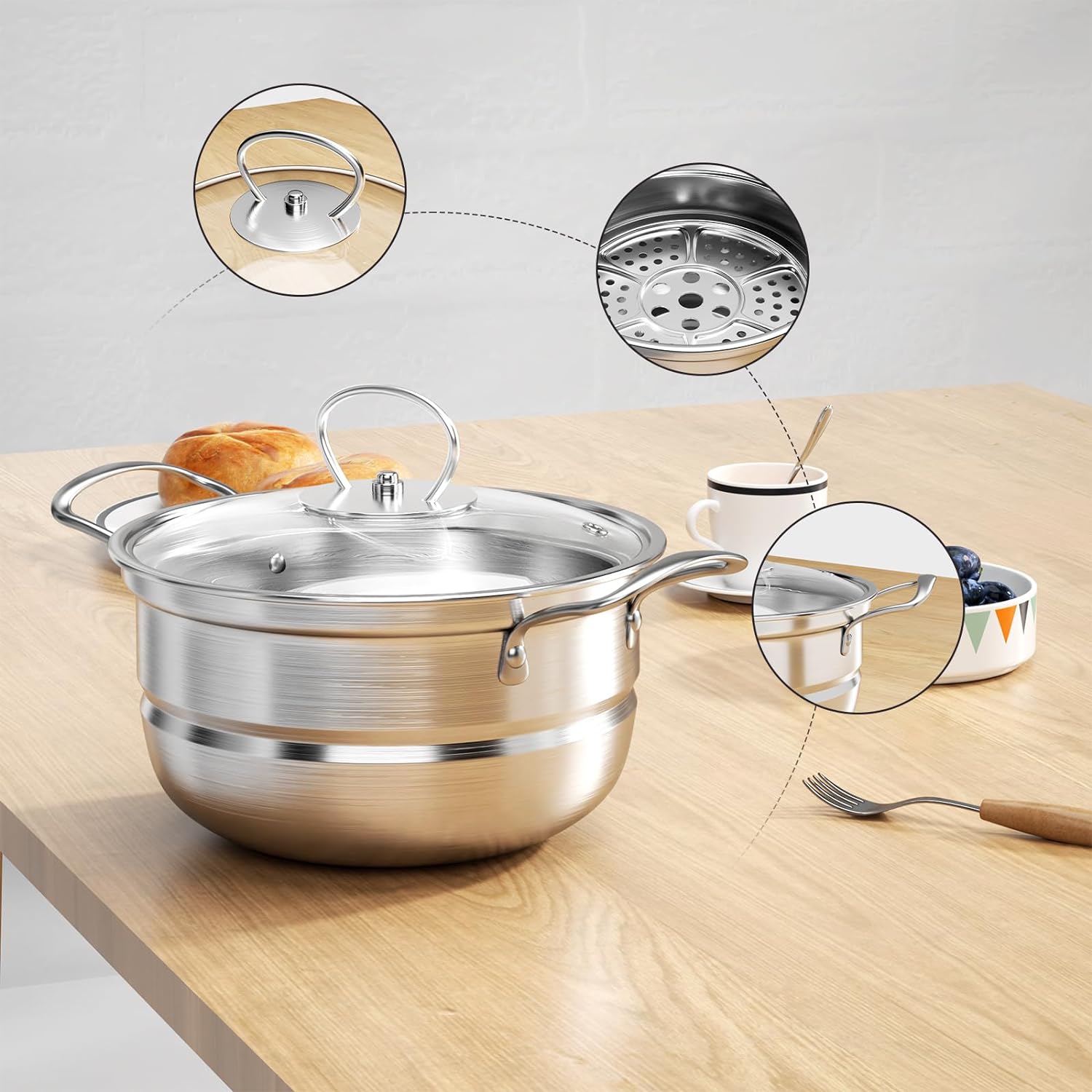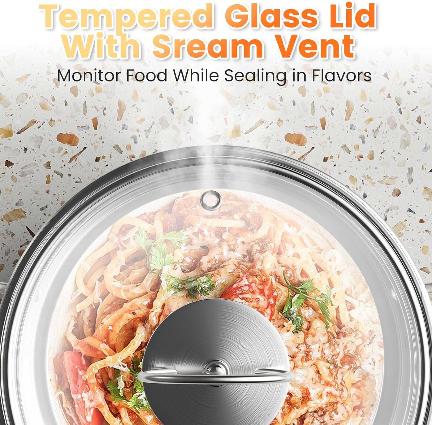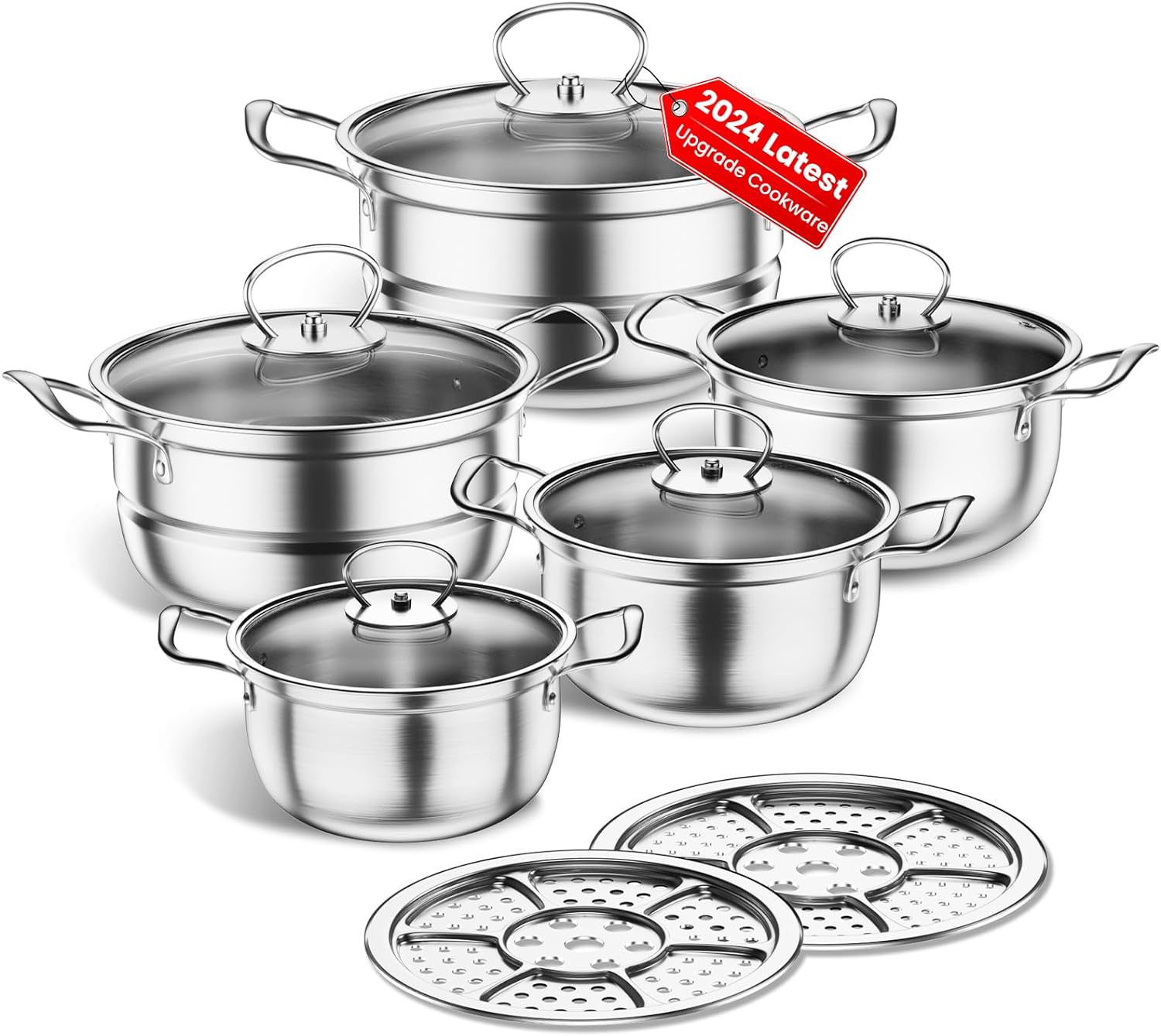 ❤️【12-PIECE COOKWARE SET】12-piece kitchen cookware sets includes: 1.5QT Sauce Pan with Glass Lid, 2,5QT Sauce Pan with Glass Lid, 3.5QT Stockpot with Glass Lid, 4.4QT Stockpot with Glass Lid, 6.9QT Stockpot with Glass Lid, and two Steamer . It’s the perfect all-in-one cooking set for all kitchen.