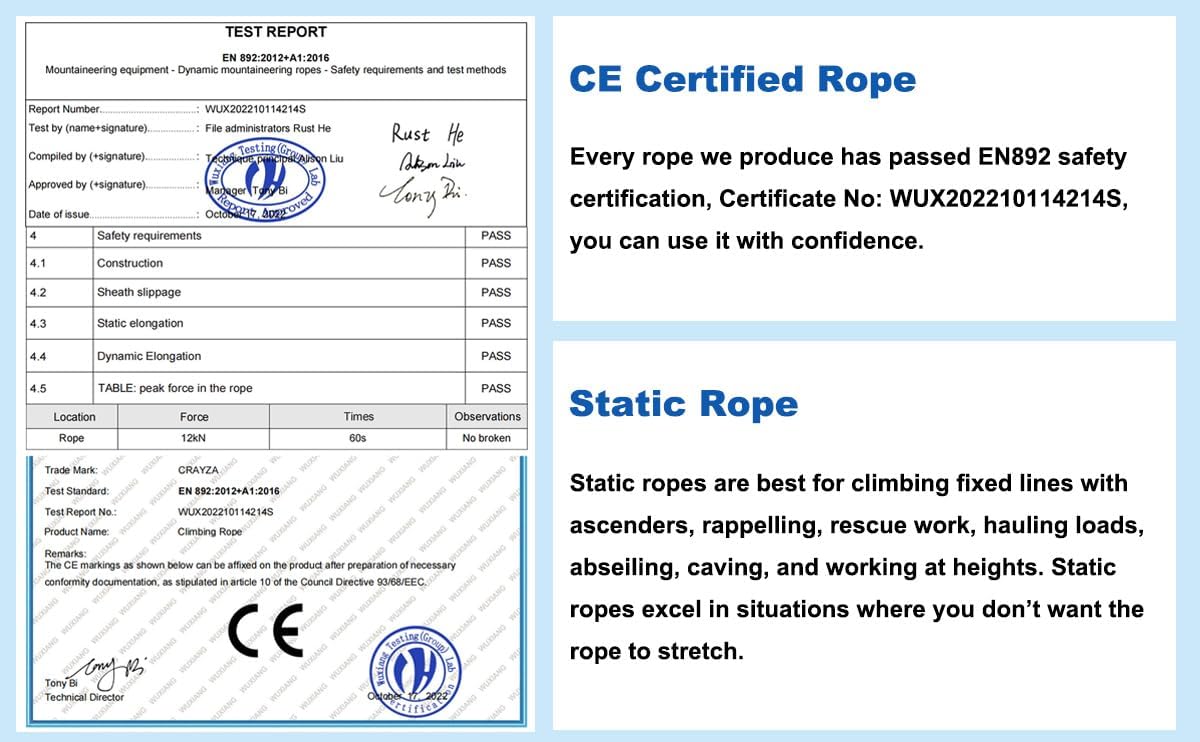 Rope Diameter: 1/2 Inch, Length: 100 Feet. Static tensile strength is CE certification.