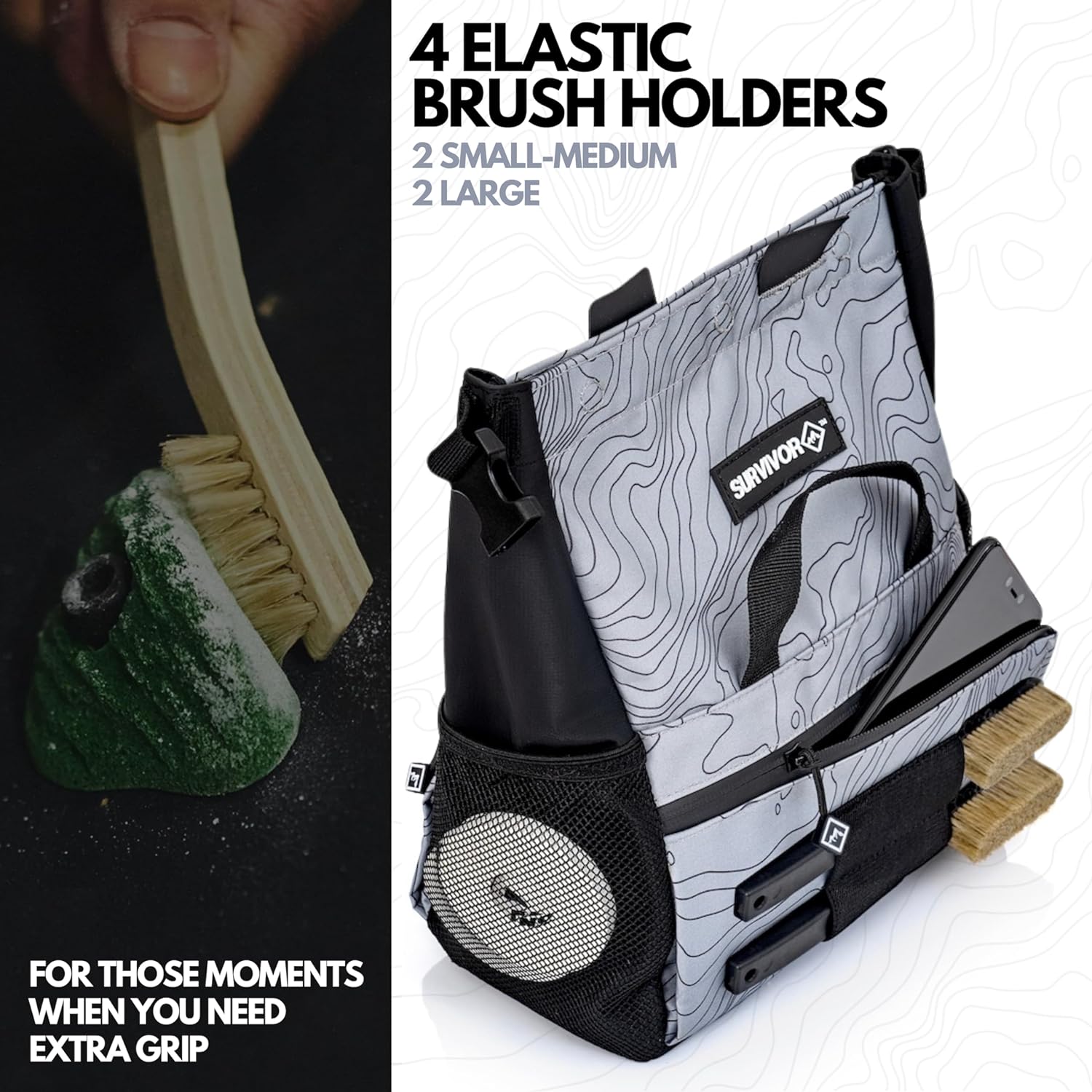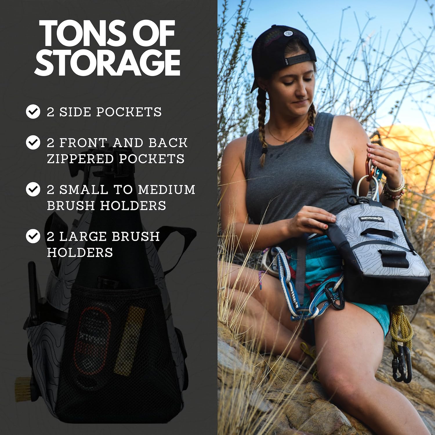 ✔️STORAGE UNIT – That’s what some people call our bouldering chalk bag. Featuring 2 Oversized, Water-resistant Zippered Pockets, 2 Side Pockets, and 4 Rock Climbing Brush Slots. Bring all of your rock climbing gear and personal belongings with you and securely store them while you climb.