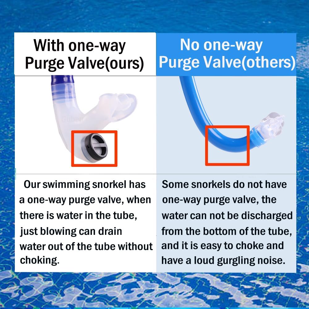 ✔【One-way purge valve with anti-shedding design】— Our swimming snorkel has a one-way purge valve, not easy to choke water, no loud gurgling noise. In addition, our one-way purge valve has an anti-shedding design on it, the white waterproof sheet can’t be shed, which prolongs life of the swimming snorkel.