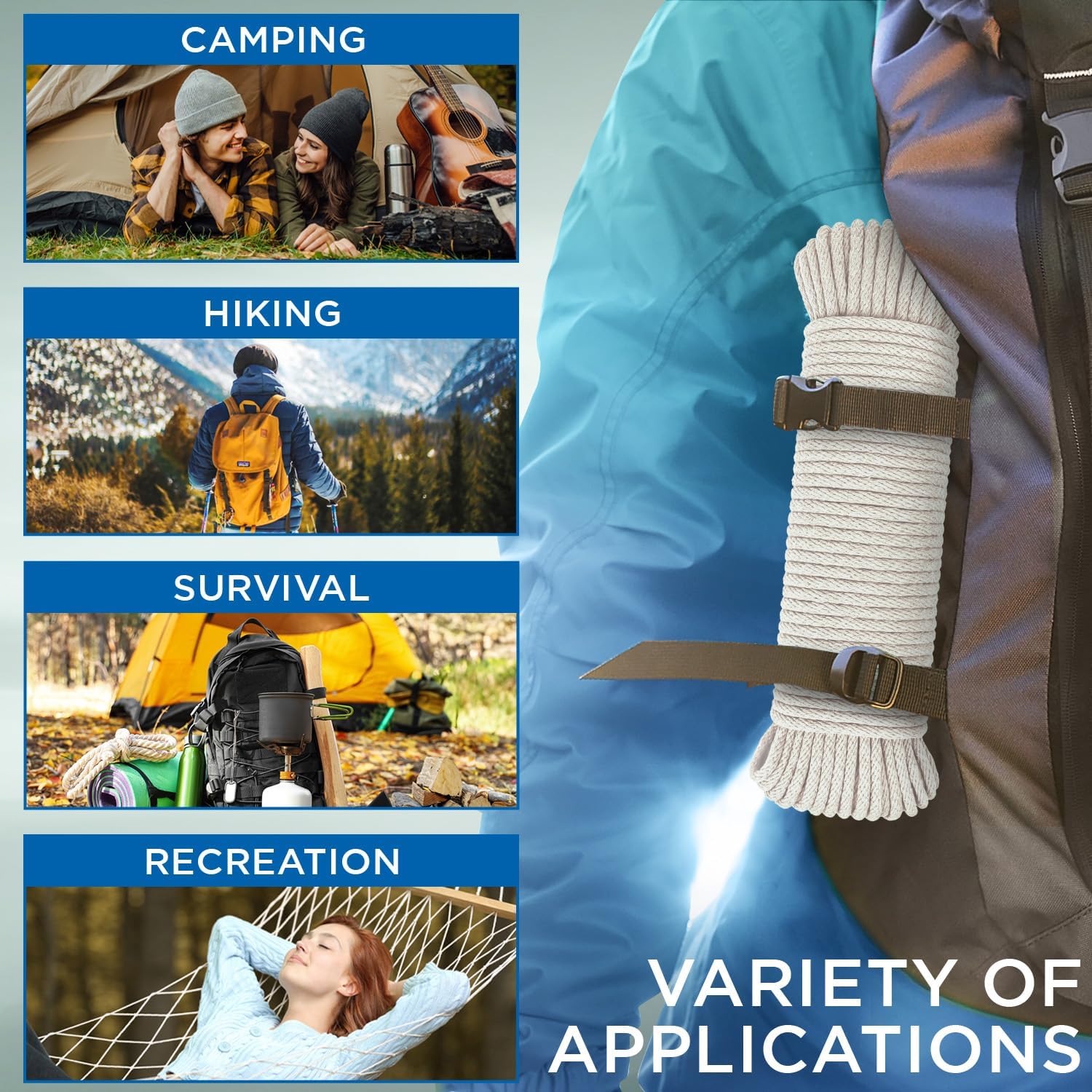 MUST-HAVE: General Application Rope is widely used for tying down equipment, weaving hammocks, as window sash cord, clothes line cord, moving rope, laundry line, flagline rope, etc. The thin cotton rope is essential for every home. Always have it on hand in your car, garage, garden or home.