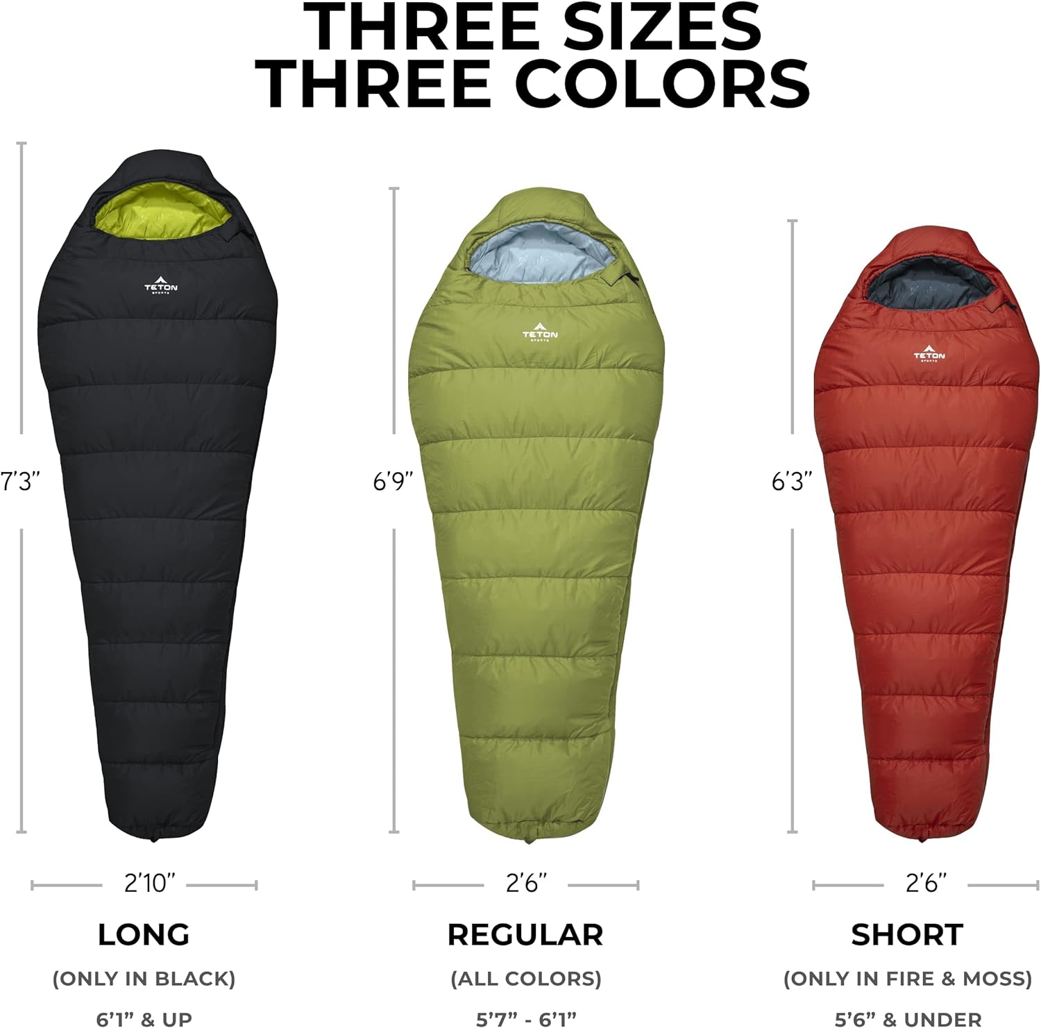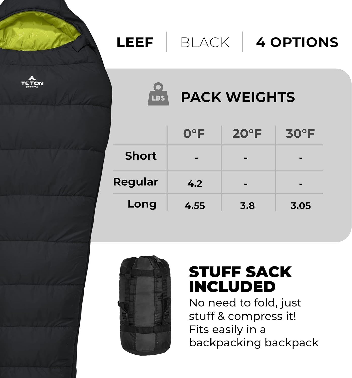 Typical mummy sleeping bags are lightweight and less bulky than rectangular bags — but they’re also notorious for being too snug. That’s why we made something better. The TETON Sports LEEF Sleeping bags are nearly four inches wider and noticeably longer than standard industry sizing. Our “short” bag is roomier than the industry regular, and our “regular” is more like an industry long. And yes, our “long” is longer than any other mummy bag we’ve looked at. TETON’s LEEF bags provide superior lightweight comfort in three temperature ratings, and the pocket-friendly price will leave wiggle room in your wallet.
