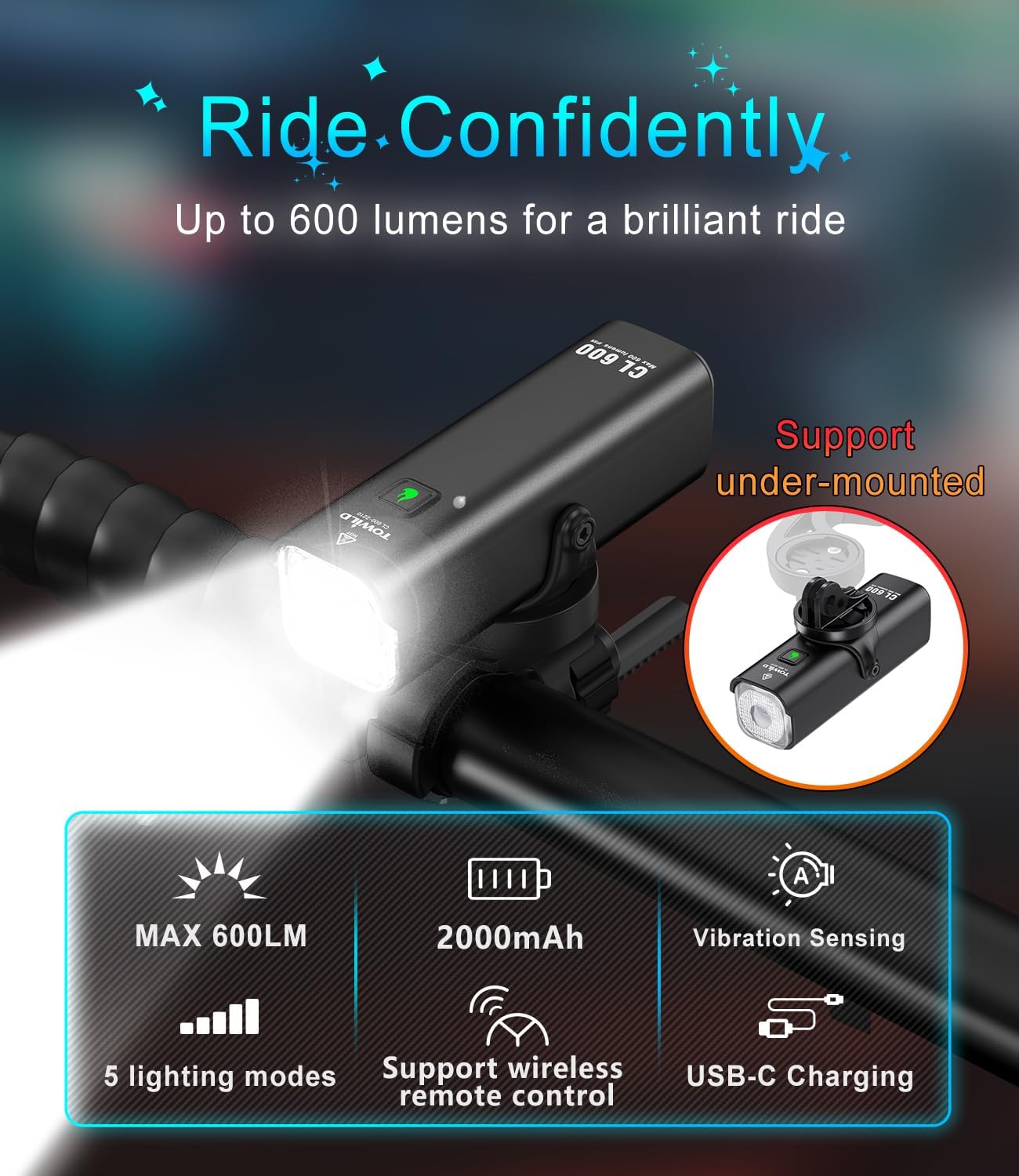 TOWILD Bike Lights for Night Riding,Compatible with Garmin/GoPro Mount,Bike Headlight,Rechargeable Battery,Waterproof Bike Front Light for Commuter Cyclists -Fits All Bikes