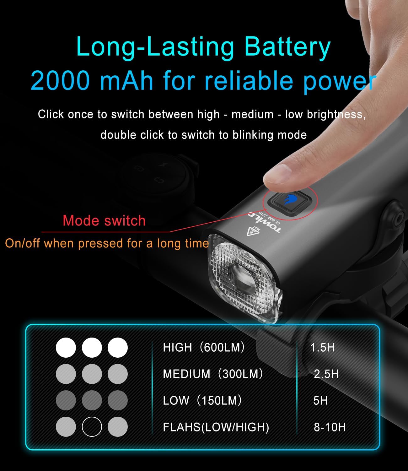 BATTERY SAFETY AND 2-YEARS CERTIFICATION -The bike light has a build-in rechargeable battery with 2000mAh, USA SST40 Led, 50,000 hours of service life.FCC certified.Professional riding manufacturer offers excellent service and 2-Years guarantee.