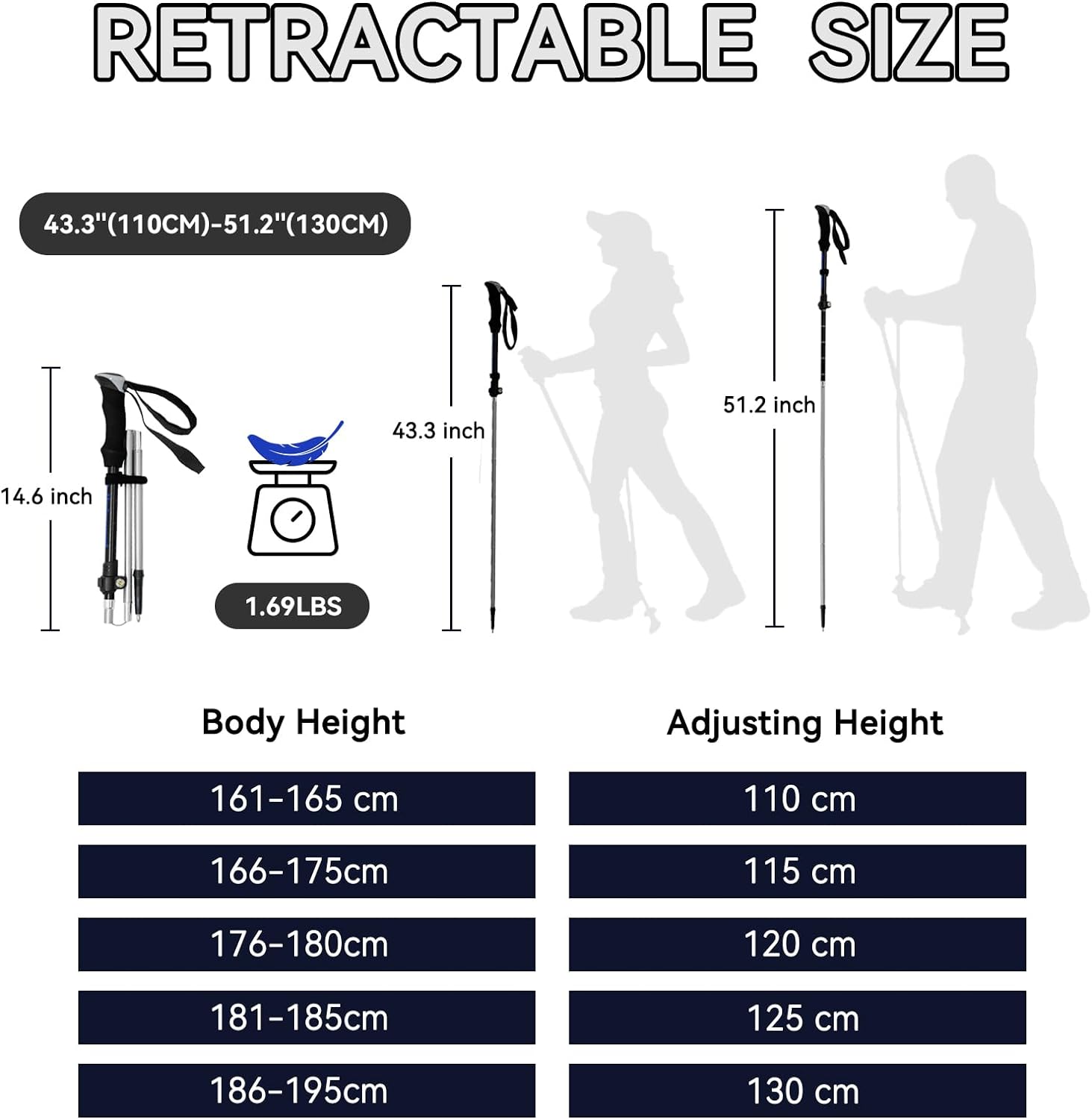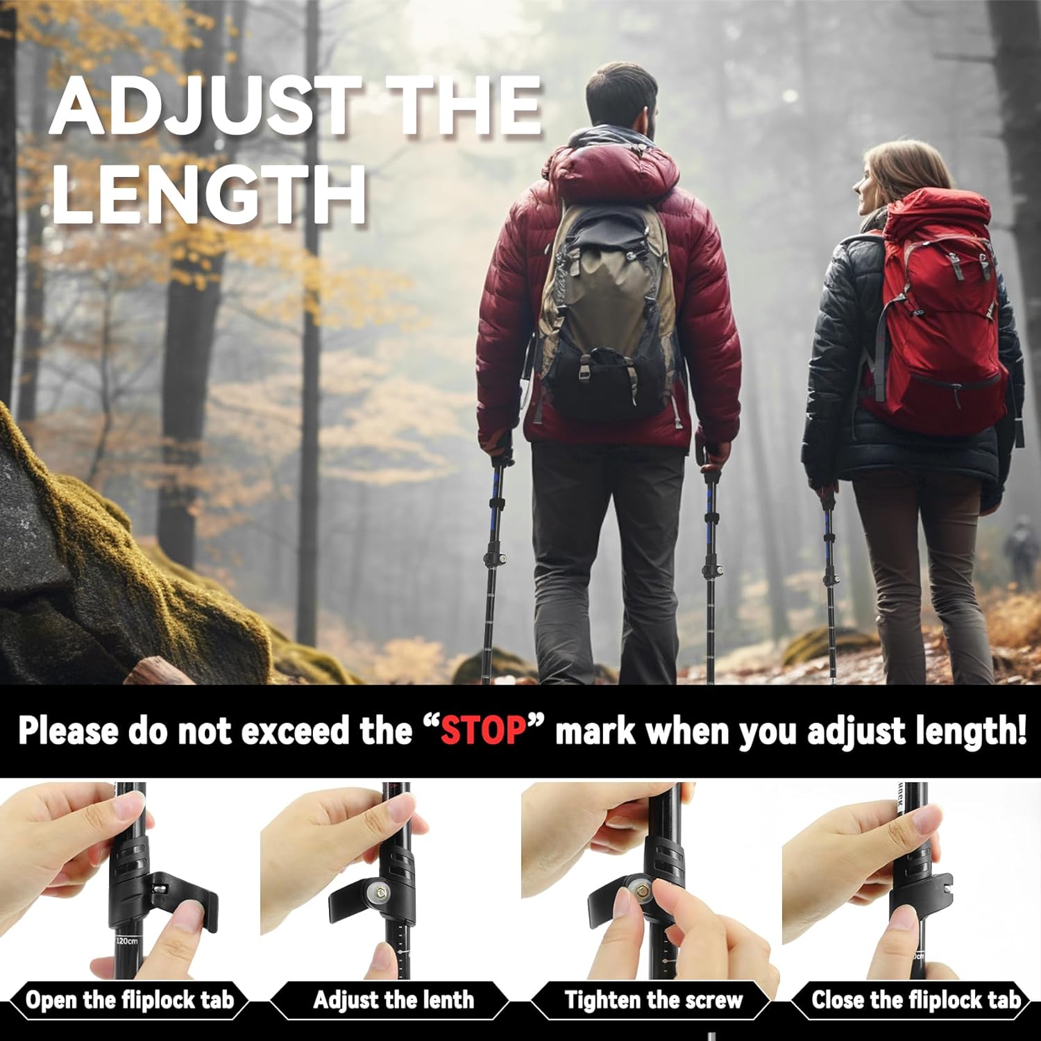 【Retractable Tri-Fold Design】 The ultralight trekking poles are designed with a retractable tri-fold mechanism, making it a simple and fast operation. The innovative flip lock technology facilitates easy adjustment of the pole’s length from 43.3”-51.2” to suit your height. With a fully folded length of 14.6”, these hiking trekking poles can be conveniently stored in your backpack. When adjusting the height of the folding trekking poles, please ensure not to exceed the ‘STOP’ mark