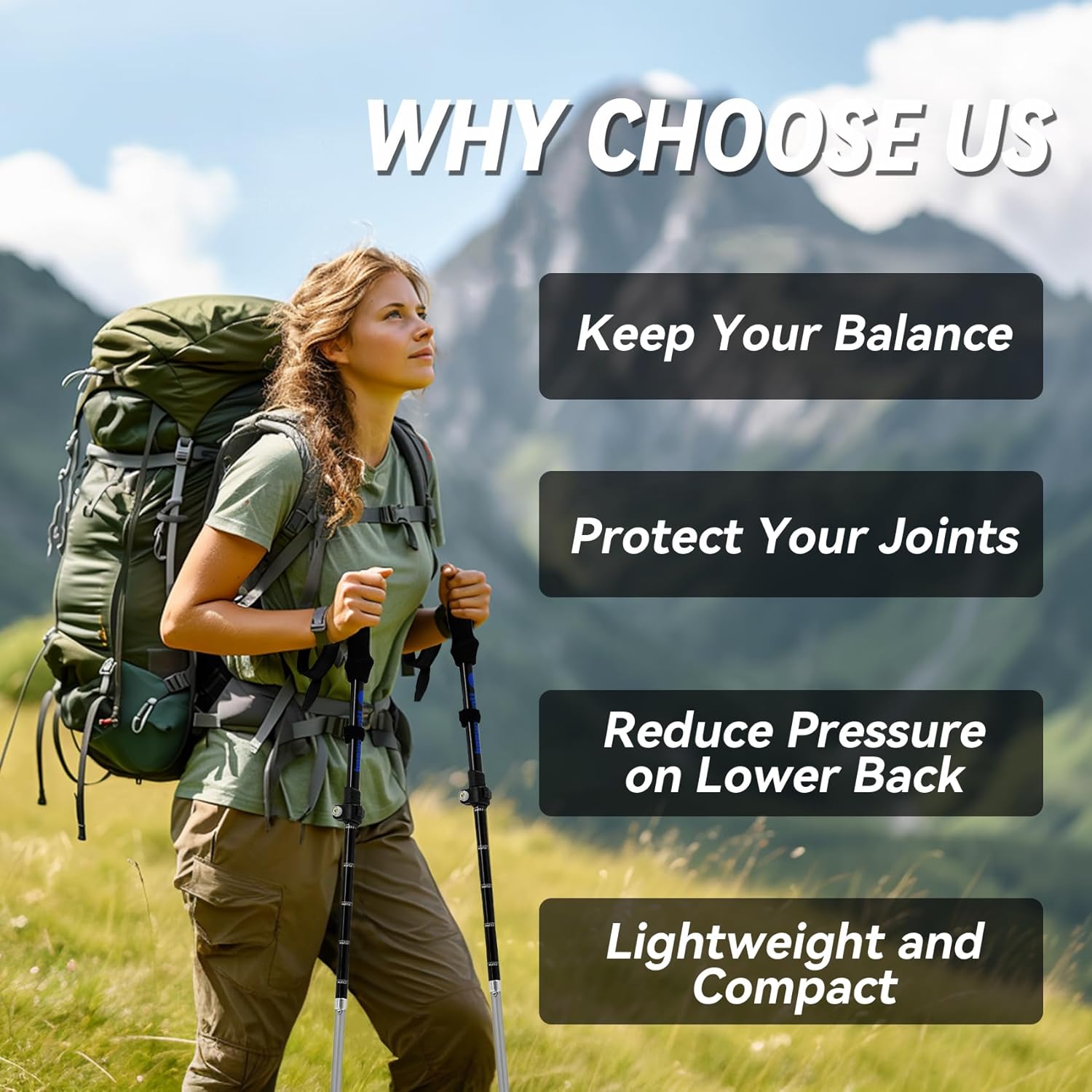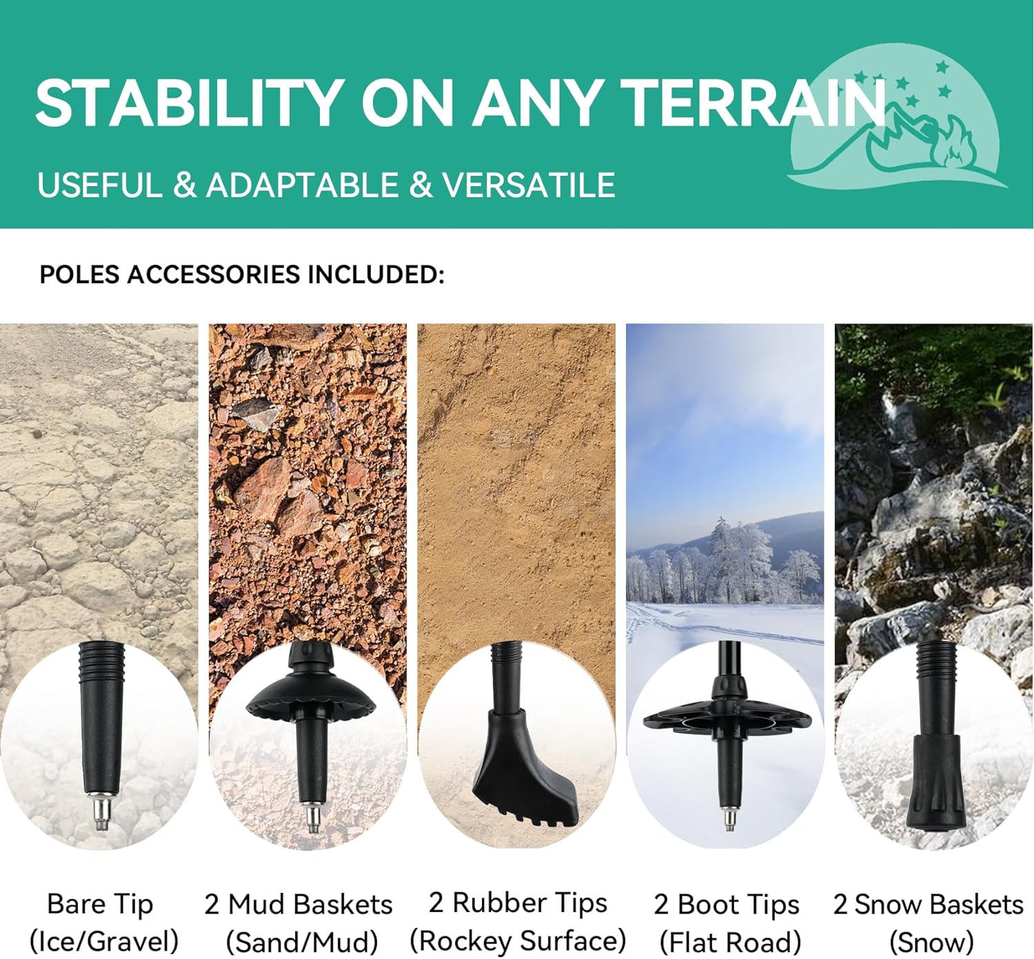 【Keep Balance & Reduce Strain】Our walking sticks for hiking provide additional points of contact with the ground, enhancing stability and balance. The four different accessories for collapsible walking sticks can be adapted to almost all uneven or challenging terrain. By transferring some of the weight from your lower body to the poles, retractable hiking poles help reduce strain on your knees and ankles