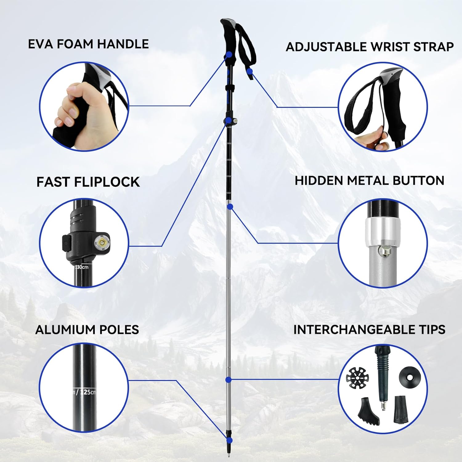 【EVA Handle & Wrist Straps】The handles of ultralight hiking poles are made from ergonomic EVA foam which wicks away sweat to help keep your hands dry and comfortable. The non-slip grooved design provides a soft and cushioned grip, minimizing hand fatigue. What’s more, the sturdy wrist straps on the folding walking sticks can be customized to your desired length, providing you with comfort and security