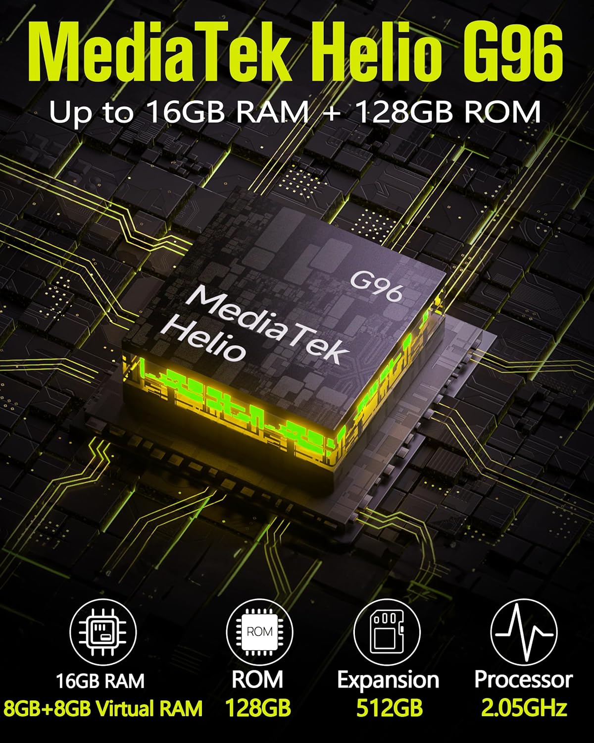 【Helio G96 & 16+128 Storage】Ulefone Armor 22 features a MediaTek Helio G96 chipset, 8-core CUP, 2.05GHz frequency, which making the phone performance smoothly, running multi-tasks etc., also up to 16GB RAM (8GB standard RAM +8GB virtual RAM), the internal storage is 128GB, a 512GB TF card can be extra to expand, more storage to save images, videos, apps and games.