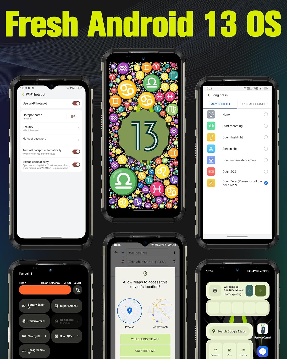 【Android 13 OS & WiFi Hotspot】Armor 22 runs Android 13 OS, which support the User Interface featured with customizable color, theme, language and even themed app icons expresses individual identity, also support WiFi Hotspot. Offering More safer and private zone with photo picker and more control for notification permissions and data.