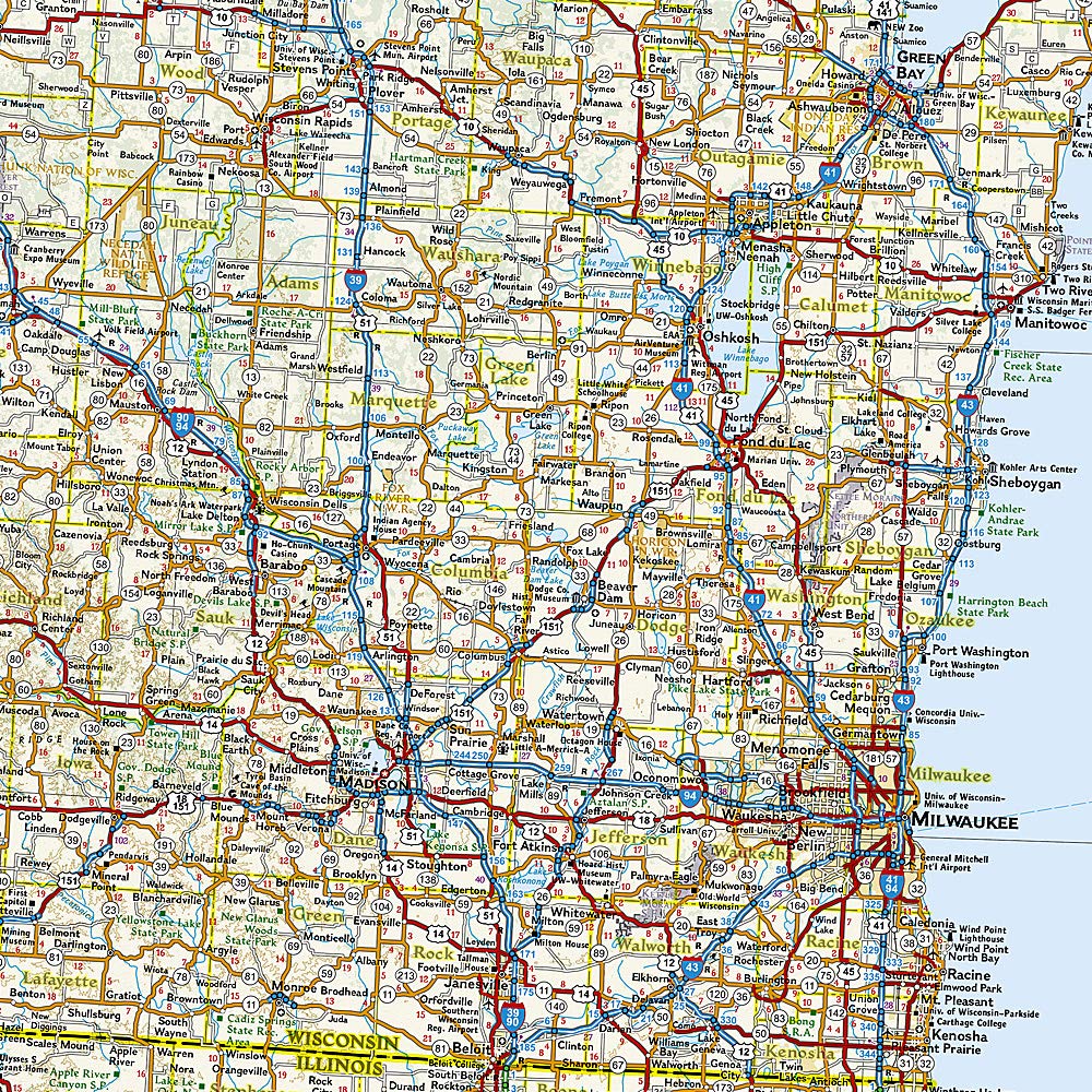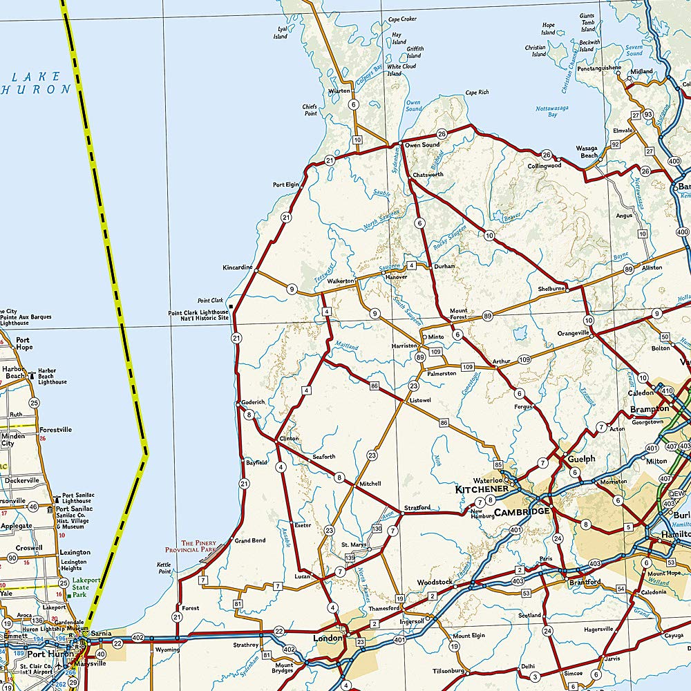 The United States Great Lakes Adventure Map will guide you to the five Great Lakes of Superior, Michigan, Huron, Erie, and Ontario. This region of the country has used the Great Lakes as a pathway for exploration, trade and recreation for hundreds of years and these traditions still thrive as witnessed by the cities and towns that border the Great Lakes. The states of Minnesota, Wisconsin, Illinois, Michigan, Indiana, Ohio, Pennsylvania, and New York all benefit from their contact with the largest freshwater lake system on Earth. The map includes the cities of Duluth, Milwaukee, Chicago, Detroit, Toledo, Cleveland, Erie, and Buffalo on the American side with Toronto, Kingston, and Windsor on the Canadian side, and the breathtaking Niagara Falls in between. There is simply no better map for exploring the states bordering the Great Lakes.