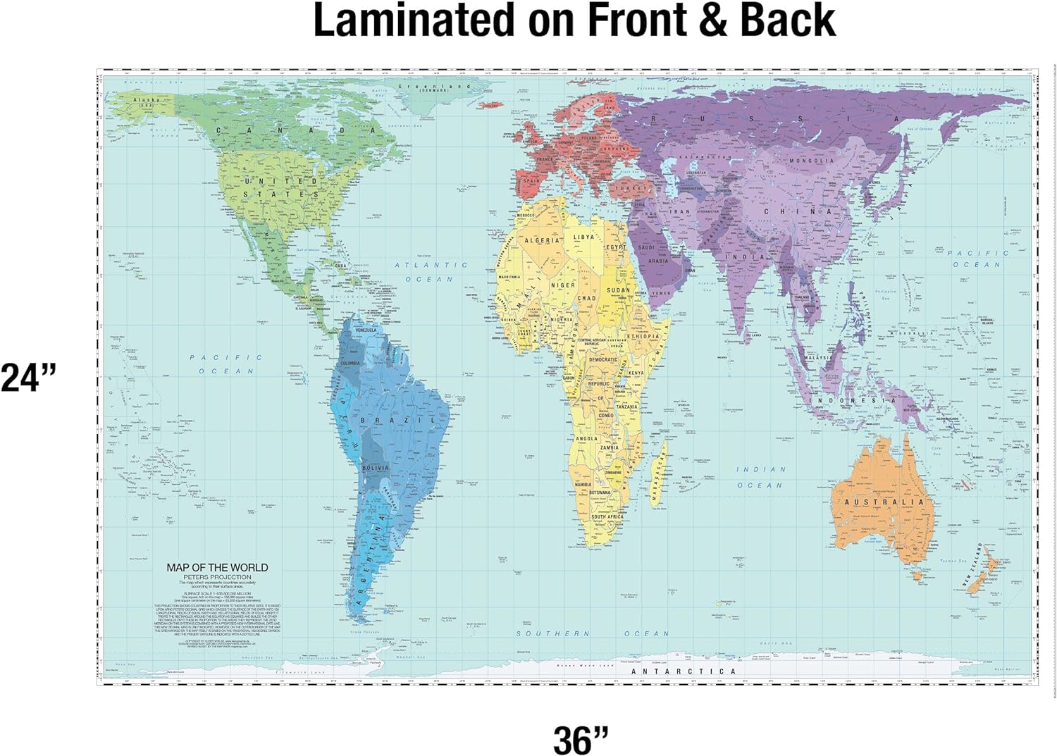 LAMINATED WORLD MAP – 36” X 24” rectangular unfolded World Map. Printed with high-quality inks and finished with a 1.7 mil satin-finish lamination on both sides. This laminated version of our up-to-date Peters Projection World map is waterproof, fade resistant, and dry-erasable. It arrives rolled (not folded) in a protective tube.