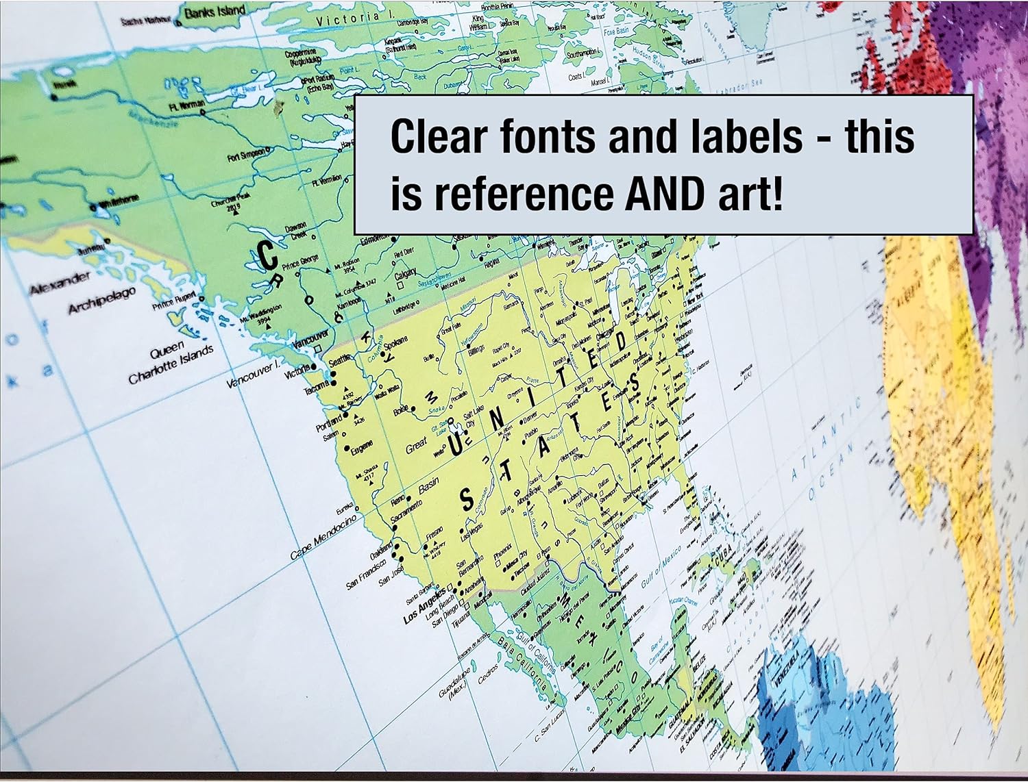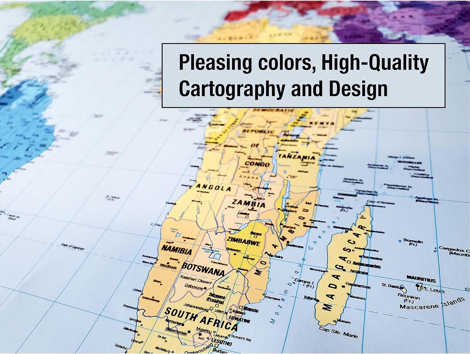 AESTHETIC AND EDUCATIONAL – This World Map comes in a multi-colored design that groups countries in each continent within the same color family, but varies the shades of color between countries for easy delineation and identification. The result is a beautiful map that is tastefully colorful as well as educational.
