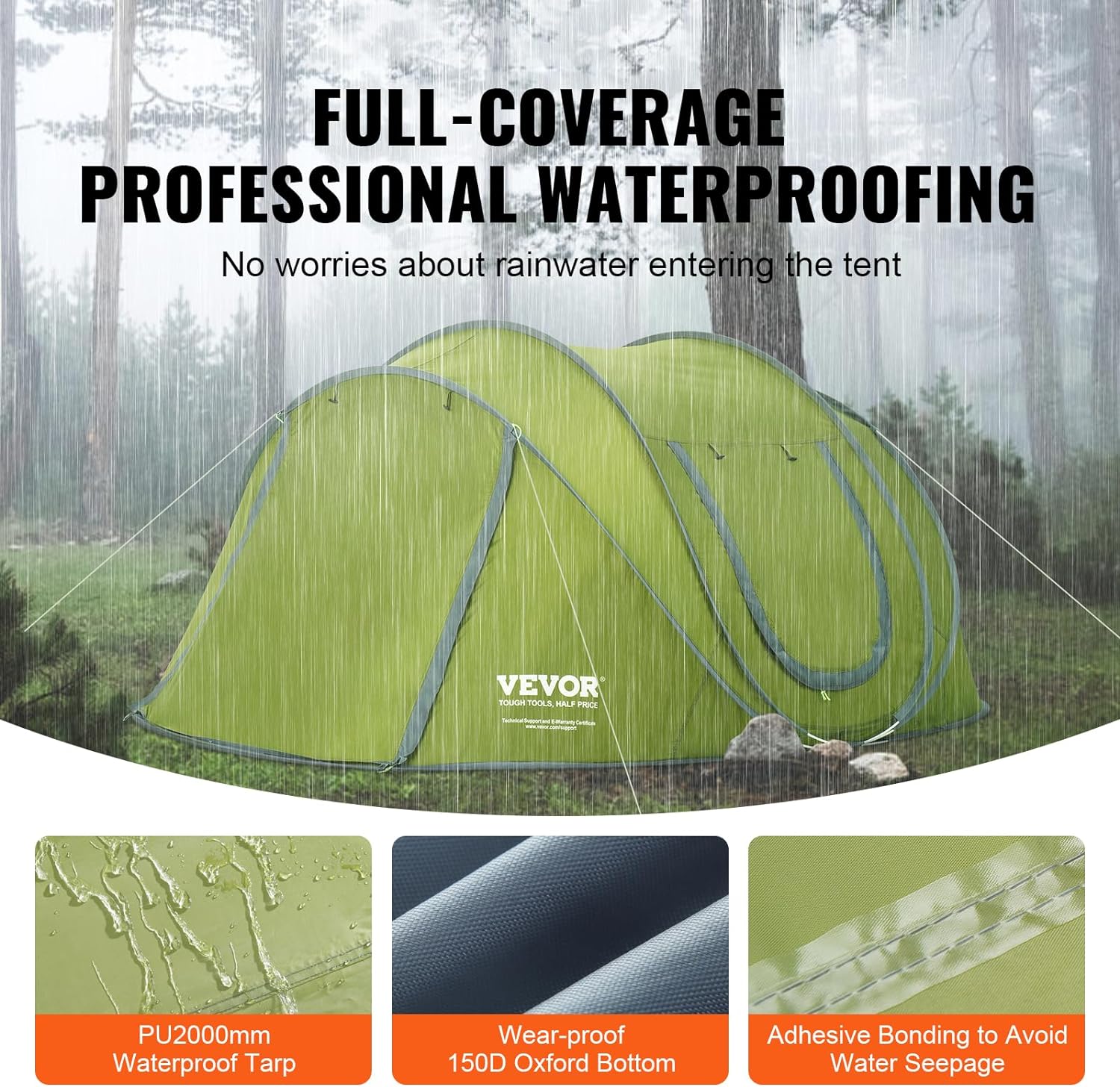 Beat the Rain: Our tent is constructed using PU2000mm waterproof tent fabric, ensuring excellent water resistance. The adhesive-sealed seams effectively prevent seepage, allowing rainwater to glide down effortlessly. Additionally, the 150D Oxford base efficiently filters ground dampness and guards against potential leakage. Bid farewell to concerns about unpredictable weather during your outdoor escapades.