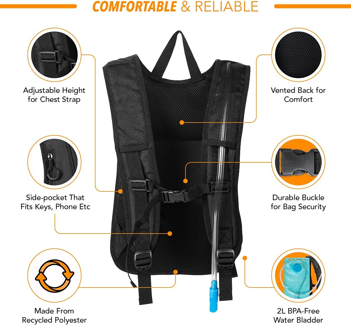 Stay leak-free with our Hydration Pack’s EVA 2L water bladder, constructed from BPA-free material for safety and durability. This bladder ensures reliability during outdoor excursions, from running marathons to music festivals. Its lightweight design and UV-resistant properties make it a must-have for adventurers seeking convenience and peace of mind.