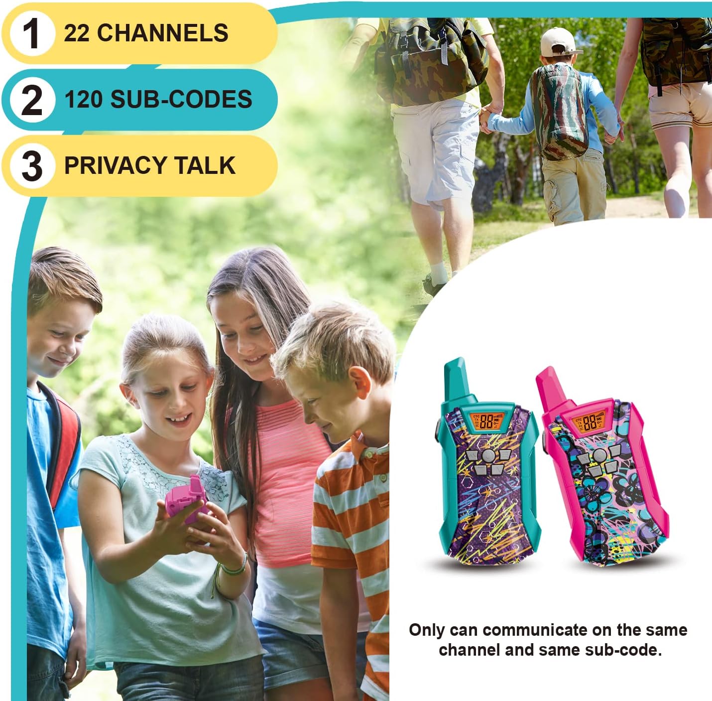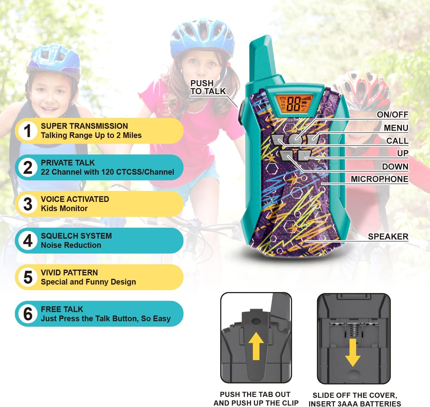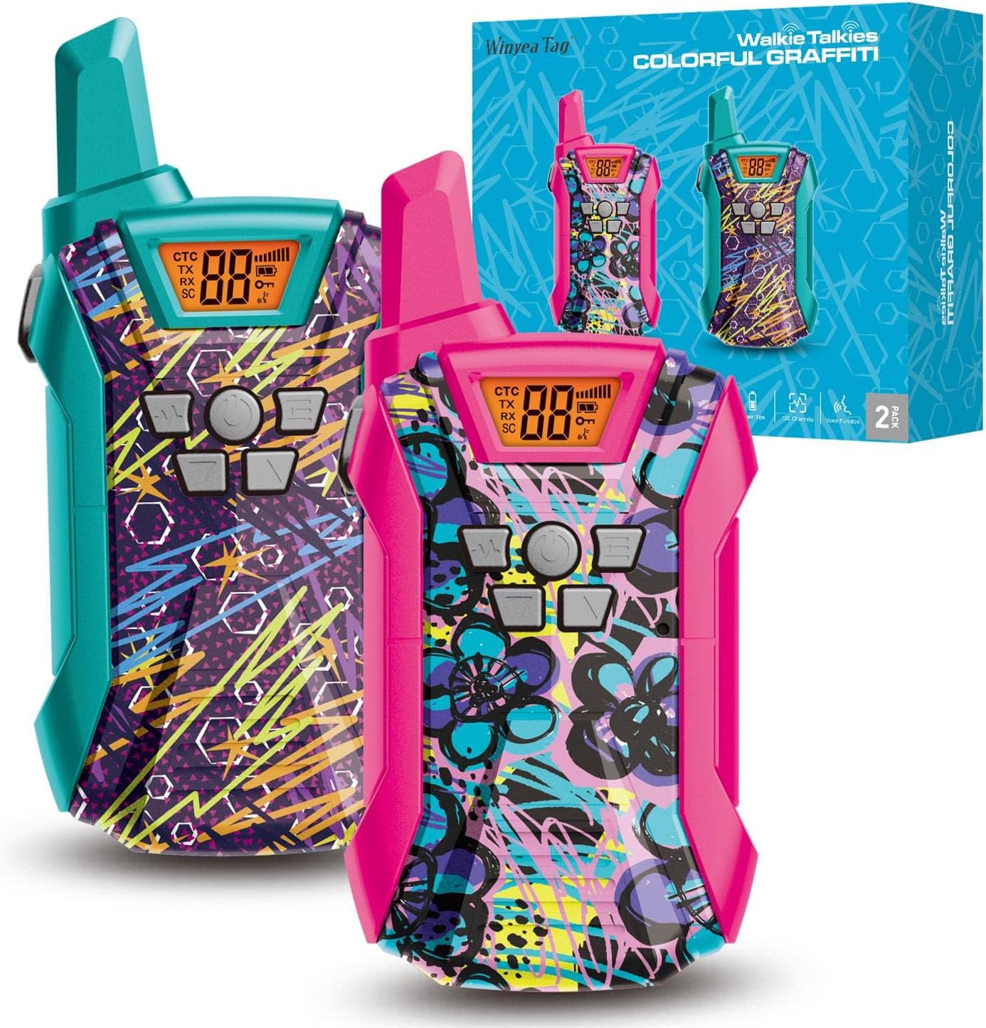 【The best design for kids】Compare with other kids walkie talkies,our walkie talkies toys are unique with special graffiti design.The compact bodies and smooth feeling is perfect for kids to take along when they are outdoor.