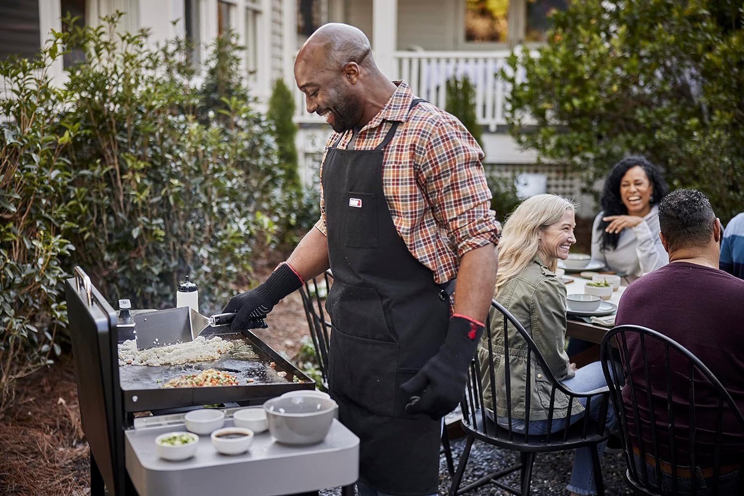TOOLS WITHIN REACH: 2 sturdy side tables provide 410 sq. In. of workspace for prepping and serving, while 4 hooks keep spatulas and other tools handy.