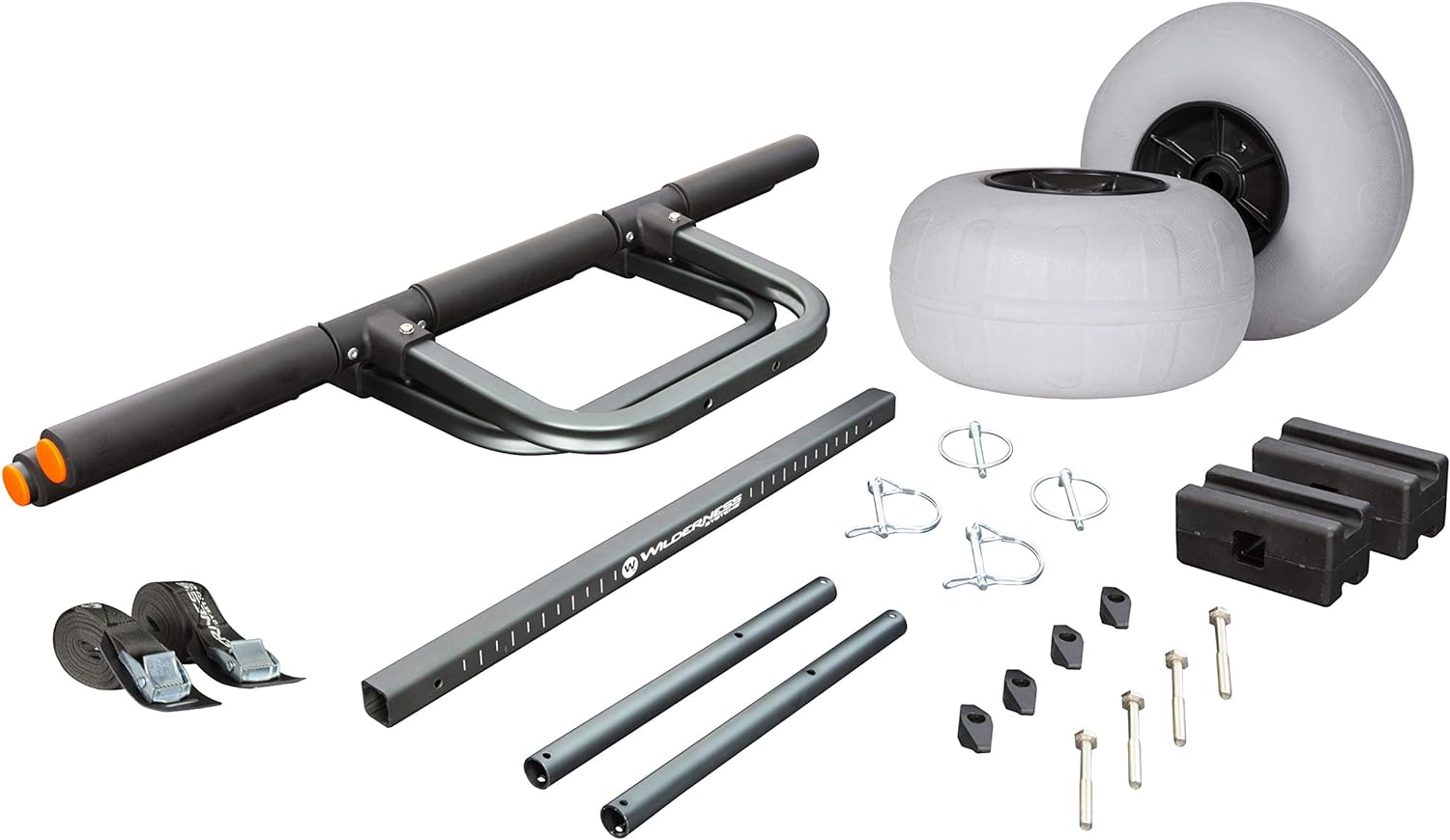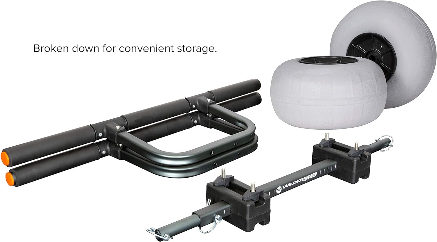 Frame storable within large kayak hatches (wheels can be removed and stored separately with bungee rigging)