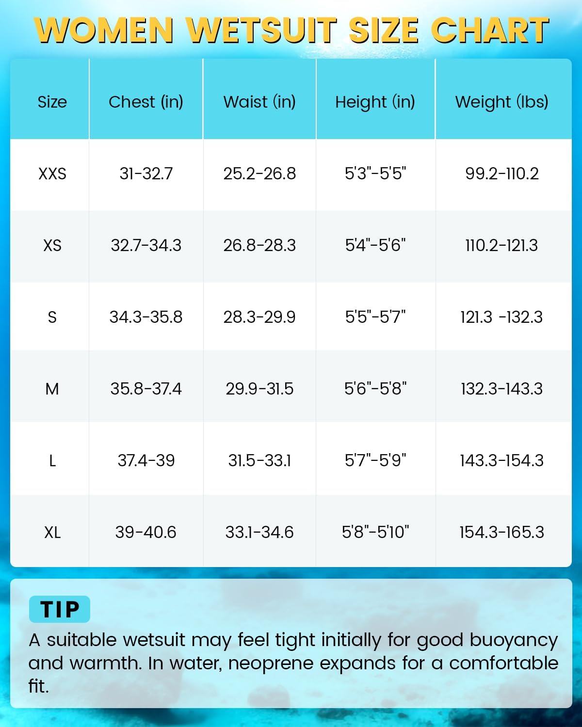 Initially, your may feel a tight fit when wearing the wetsuit, but this is normal and ensures good buoyancy and insulation. Once in the water, the neoprene will absorb water and expand, making the suit feel less tight and more comfortable compared to when dry.