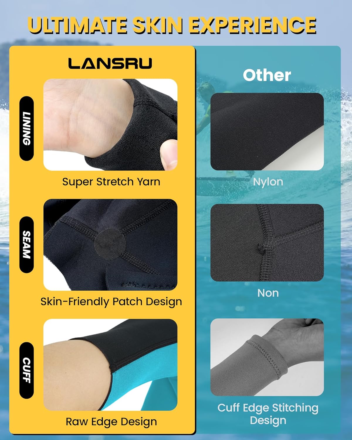 Advanced Insulation: Lansru’s 3MM SCR NEOPRENE wetsuits excel in elasticity and warmth, surpassing those made with SBR neoprene commonly used by other brands. Experience a snug fit that minimizes gaps and maximizes warmth. Neoprene absorbs water and molds closely to your body, forming a thin layer that regulates body temperature and keeps you warm in cold waters. This enhanced neoprene allows water enthusiasts to prolong their time in the water and fully embrace their aquatic adventures.