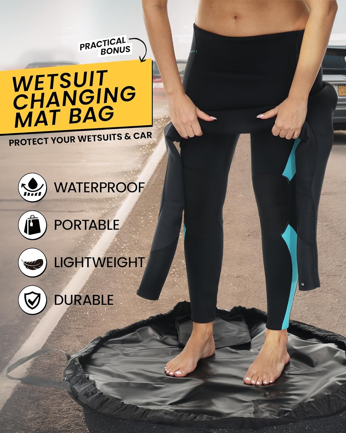 Practical Bonus: Included a portable WETSUIT CHANGING MAT BAG with every purchase of our wetsuit. This thoughtful gift not only shields your wet suit from potential damage but also safeguards your precious car. When changing wetsuits at the beach, the mat prevents sand from causing any harm, prolonging the lifespan of wetsuits. Featuring compartment pockets for storing small items and a waterproof mat to prevent your wet surfing gear from soiling your car’s interior, guaranteeing a clean space.