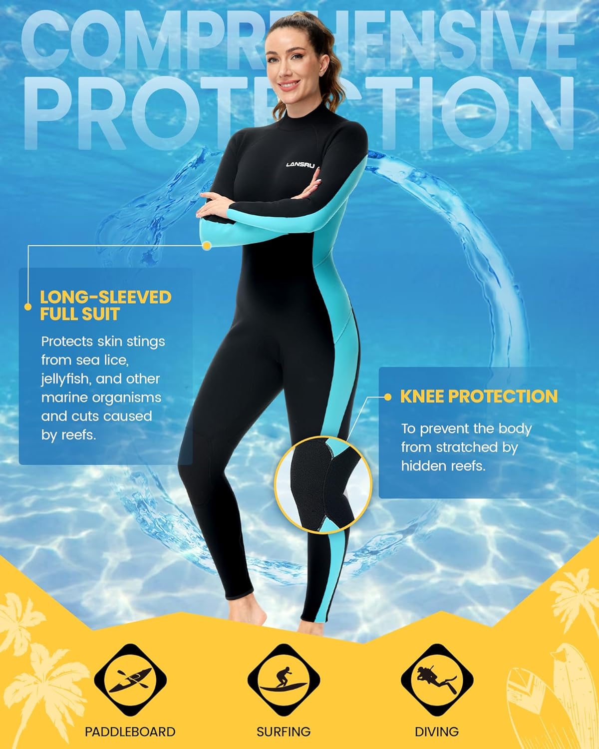 Safety & Sun Protection: The long-sleeved full swimsuit has comprehensive protection for your water activities. It protects skin stings from sea lice, jellyfish, and other marine organisms and cuts caused by reefs. THICKENED KNEE PADS can keep your knee safe from injury, permitting your water activities like surfing, paddleboarding, and kayaking. Full wetsuits double as rash guards reduce skin exposure and contain UV protection, providing UPF 50+ sun protection for your entire body.
