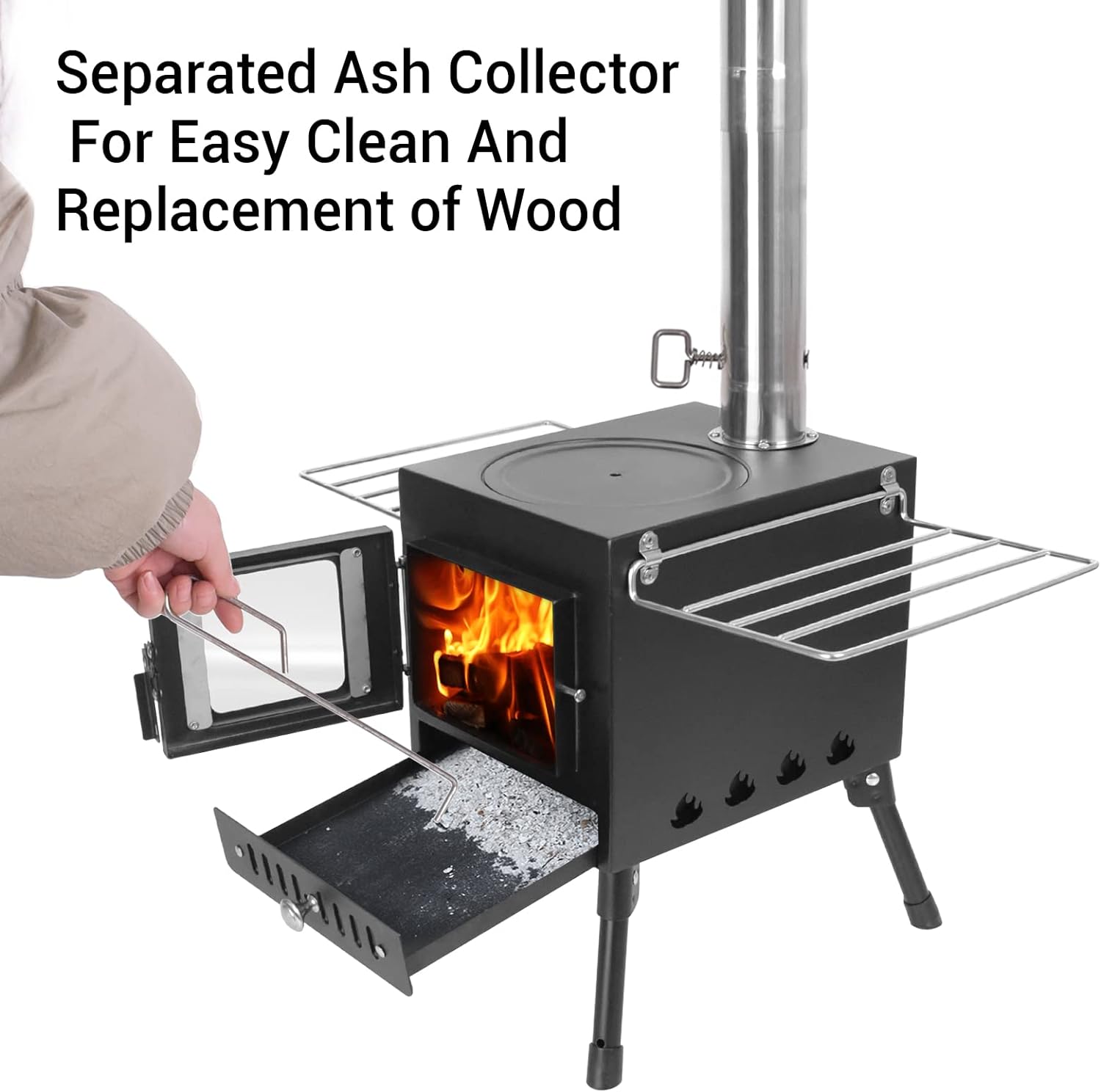 SEPARATE ASH BOX – The pull-out, removable ash accumulation box allow for better separation of burning firewood and ash, not only for clean burning of firewood, but also for easy dumping of dust. Perfect cleaning combustion environment for cooking / BBQ.