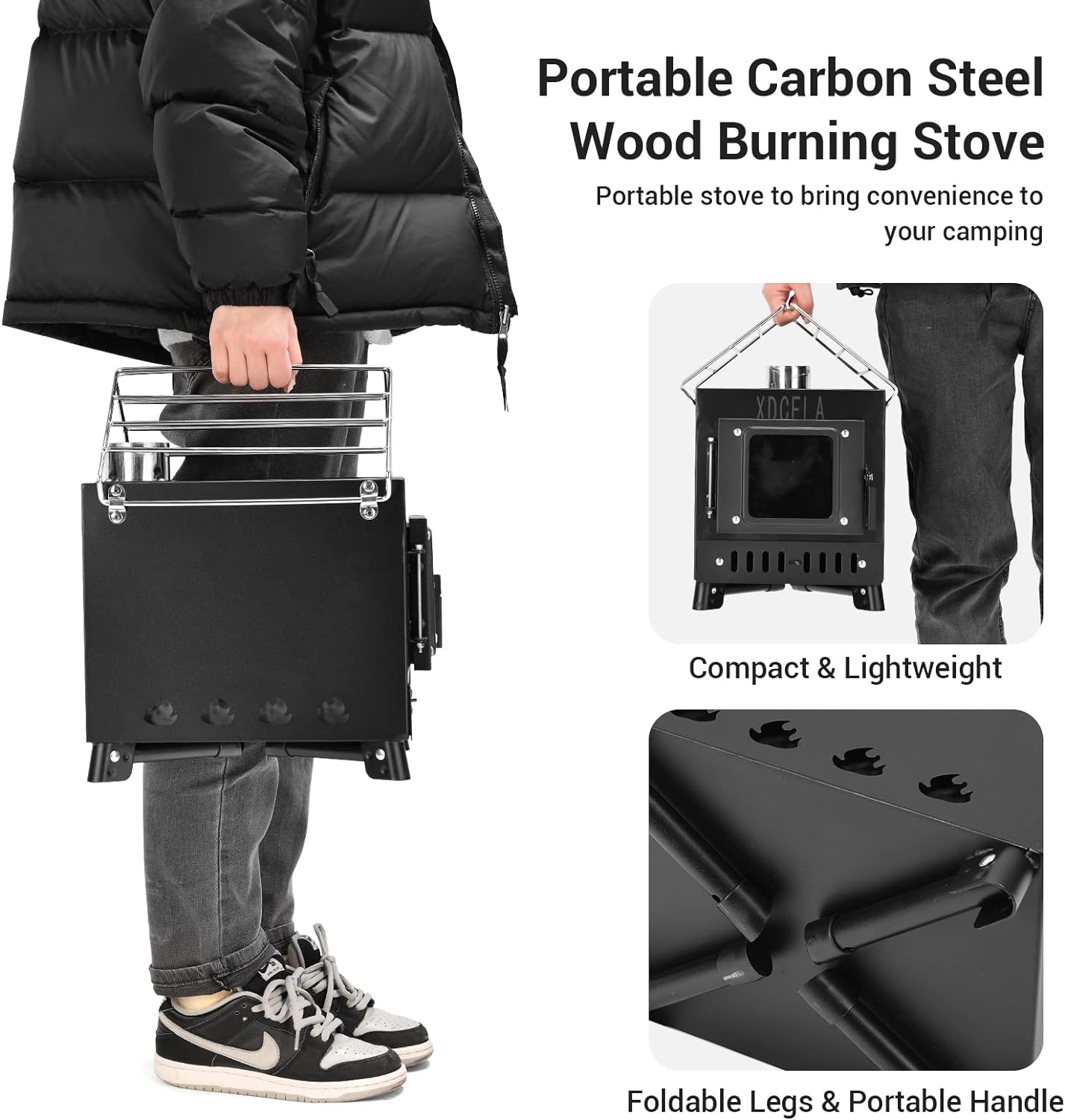 MULTI-PURPOSE WOOD STOVE – Specially designed for outdoor. Size: Weight: , easily portable. Nothing worse than having a cold and miserable night in a tent. XDCFLA small wood burning stove can bring you a enjoyable camping life: Warm up your tent/water/food, Make coffee, Dry damp clothes etc. The expanded stand is also designed to carry or shelve clothes/foods.