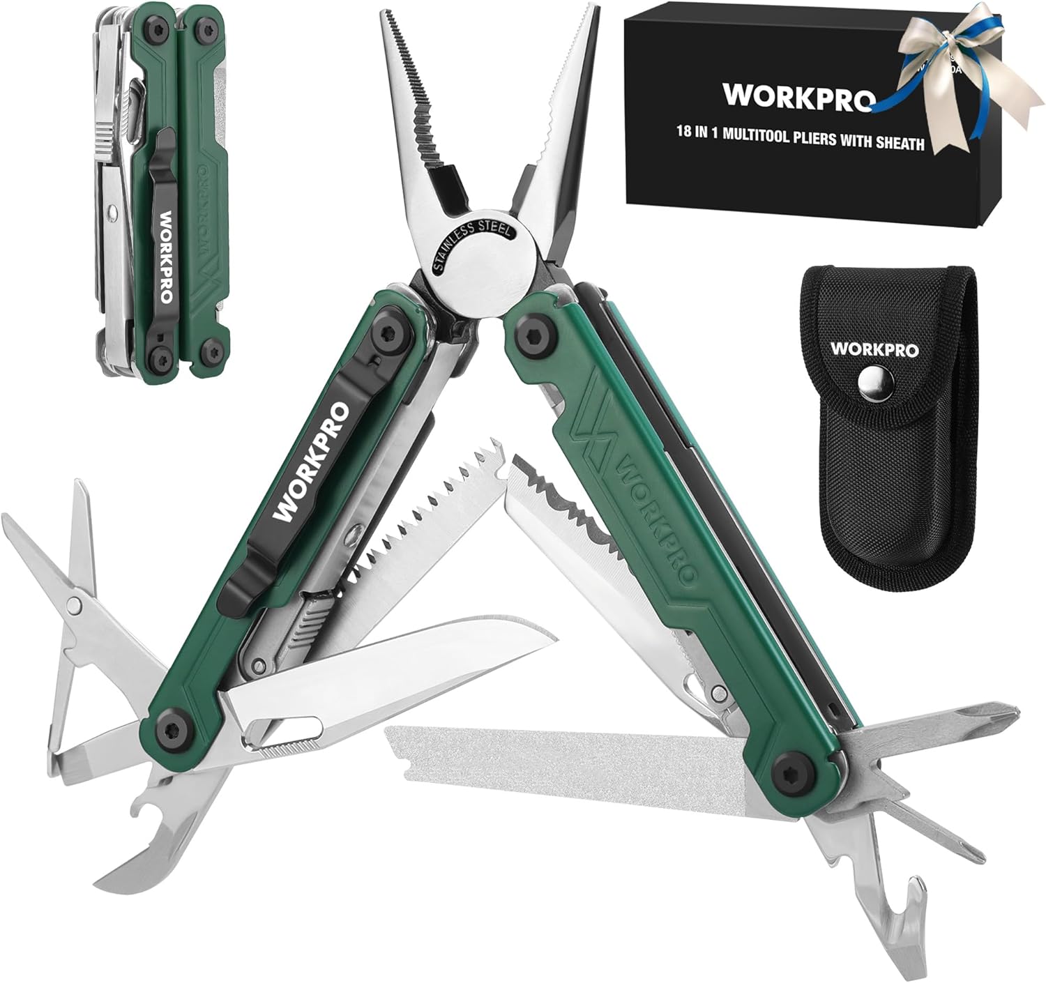 WORKPRO 18-in-1 Multi Tool Pliers, Stainless Steel EDC Multitool with Pocket Knife, 2 Safety Locks, Belt Clip and Oxford Pouch, Multipurpose Utility Multiuse Tool for Camping Outdoor Activities