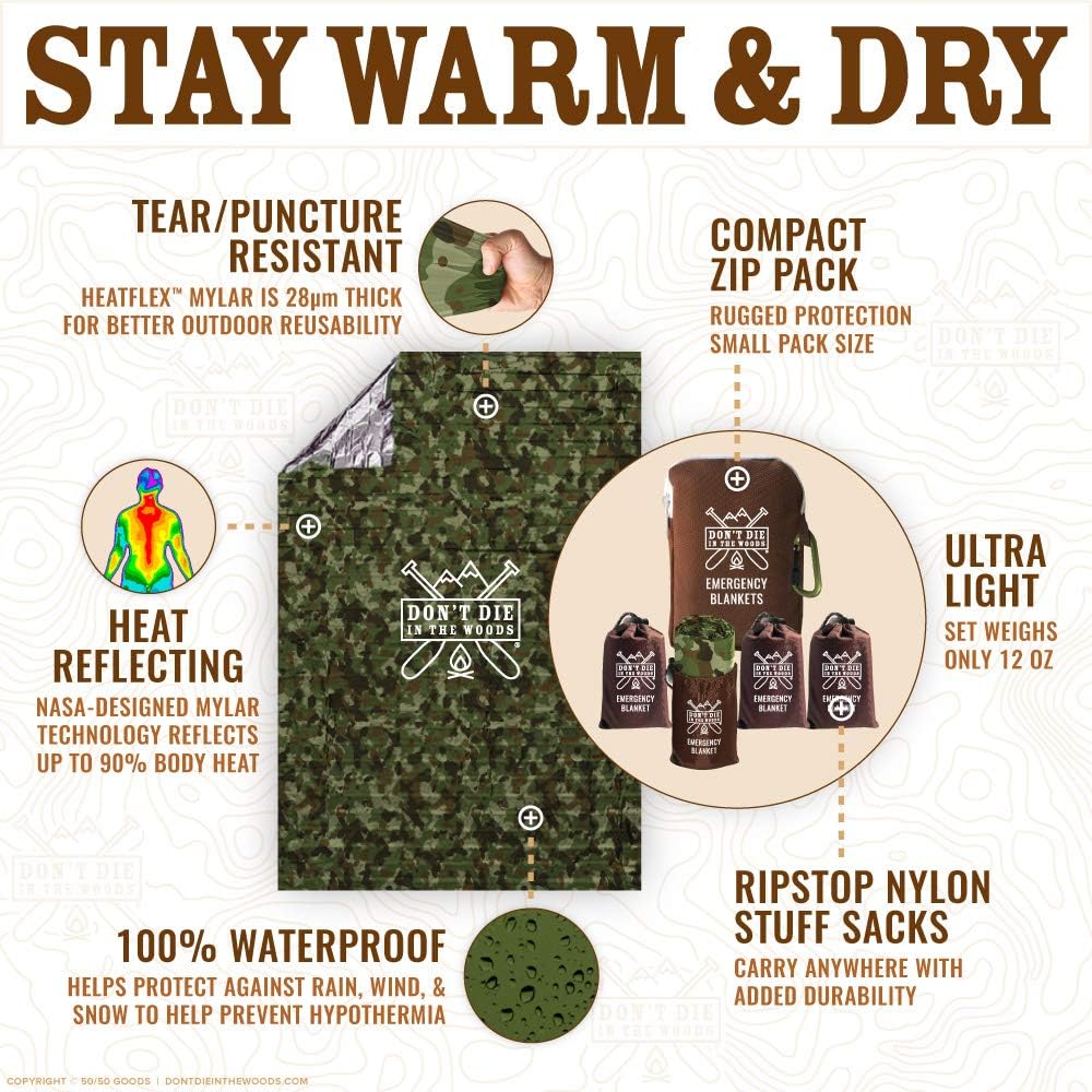 DON’T DIE IN THE WOODS. Be prepared with the world’s toughest emergency blankets.